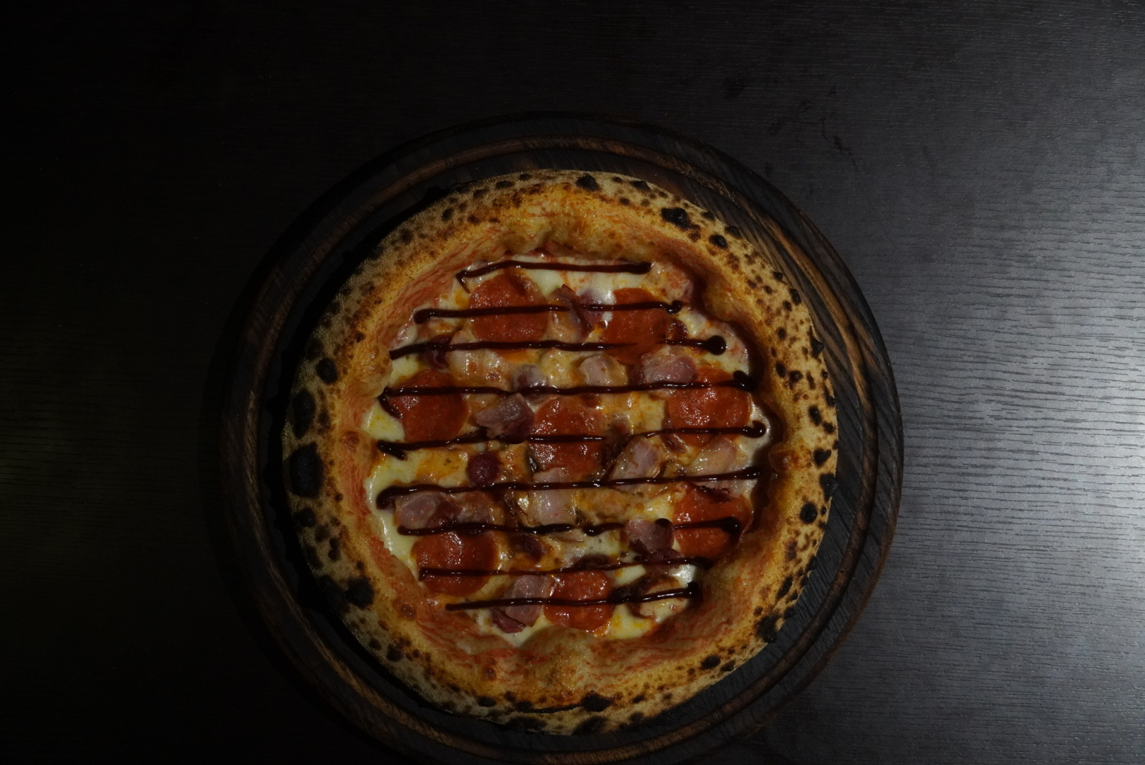 Тесто для пиццы, соус томатный, сыр моцарелла, филе куриное, бекон, охотничьи колбаски, пепперони, соус BBQ.