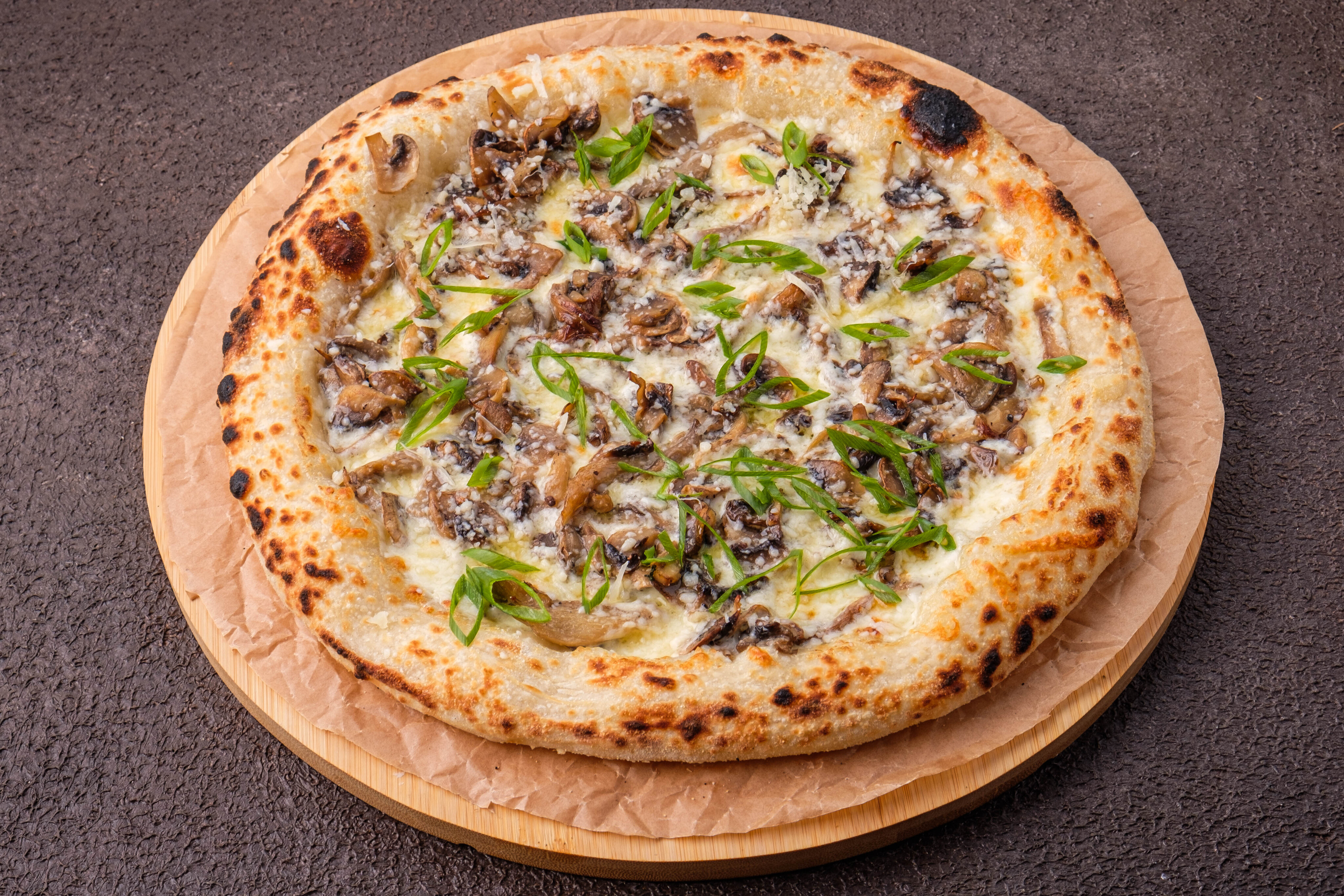 Тесто для пиццы, соус блю чиз, сыр моцарелла, грибы шампиньоны, сыр пармезан, лук зеленый.
