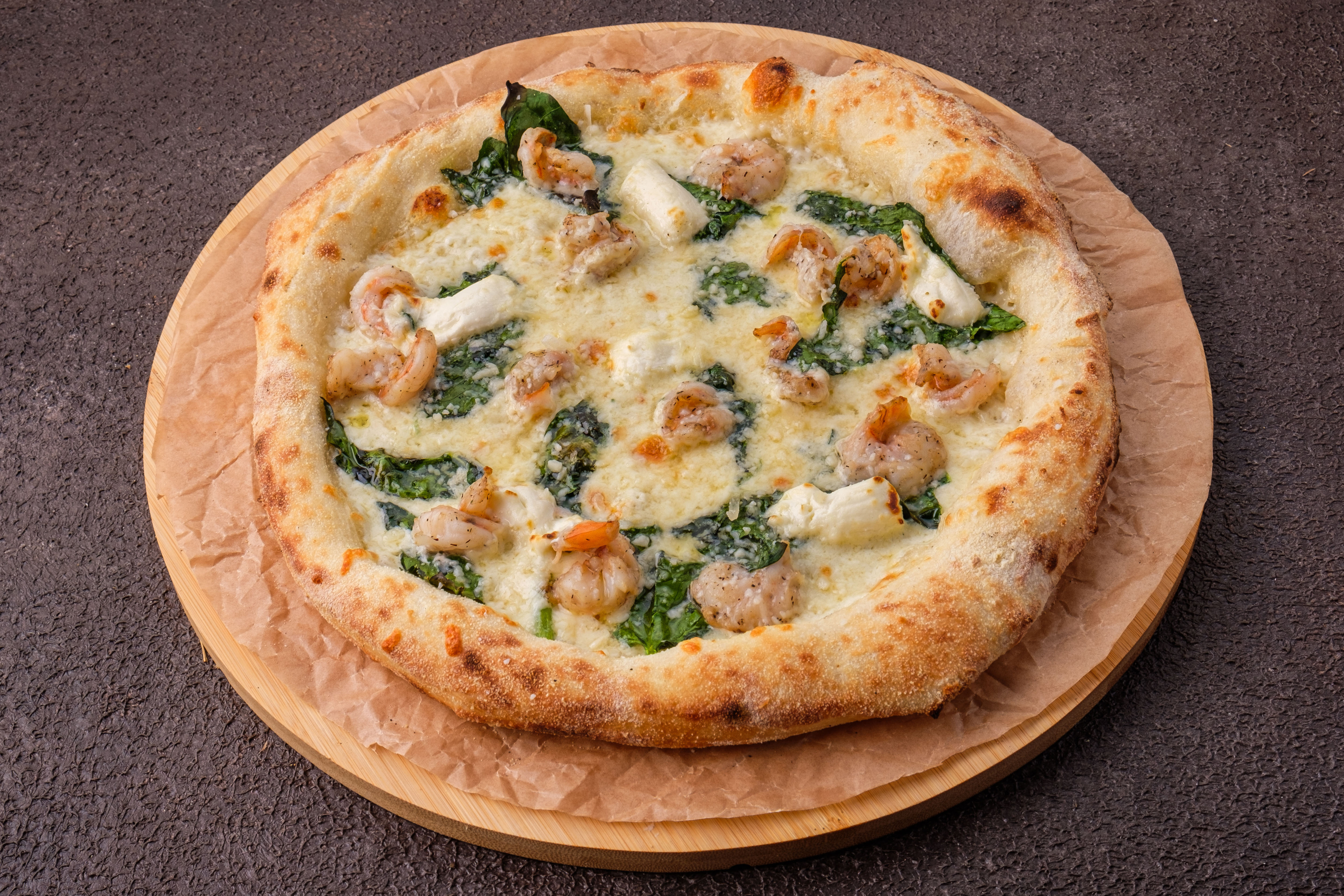 Тесто для пиццы, соус блю чиз, сыр моцарелла, шпинат, креветки, сыр пармезан, масло чесночное, сыр маскарпоне.
