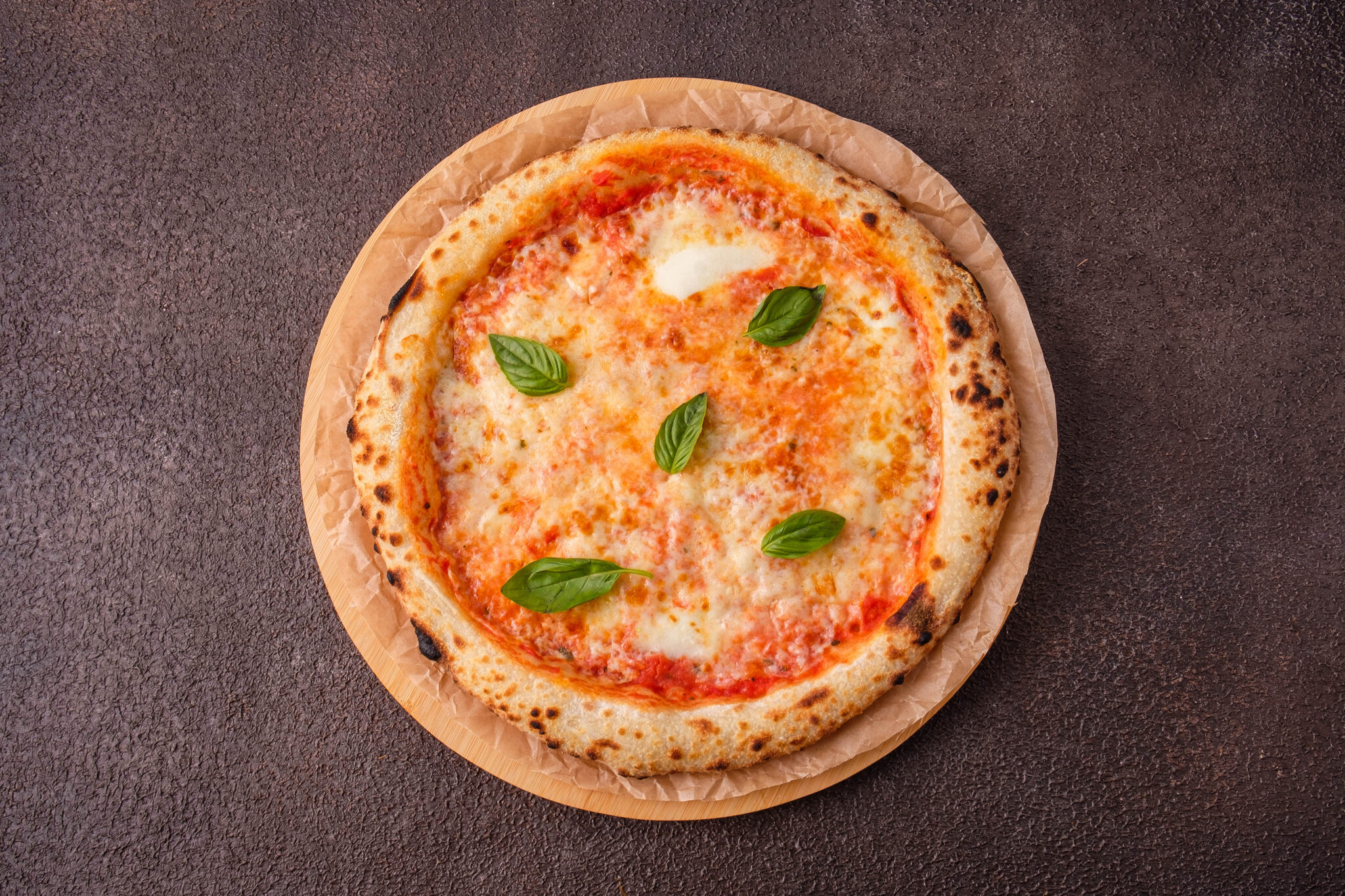 Тесто для пиццы, соус томатный, сыр моцарелла, базилик.