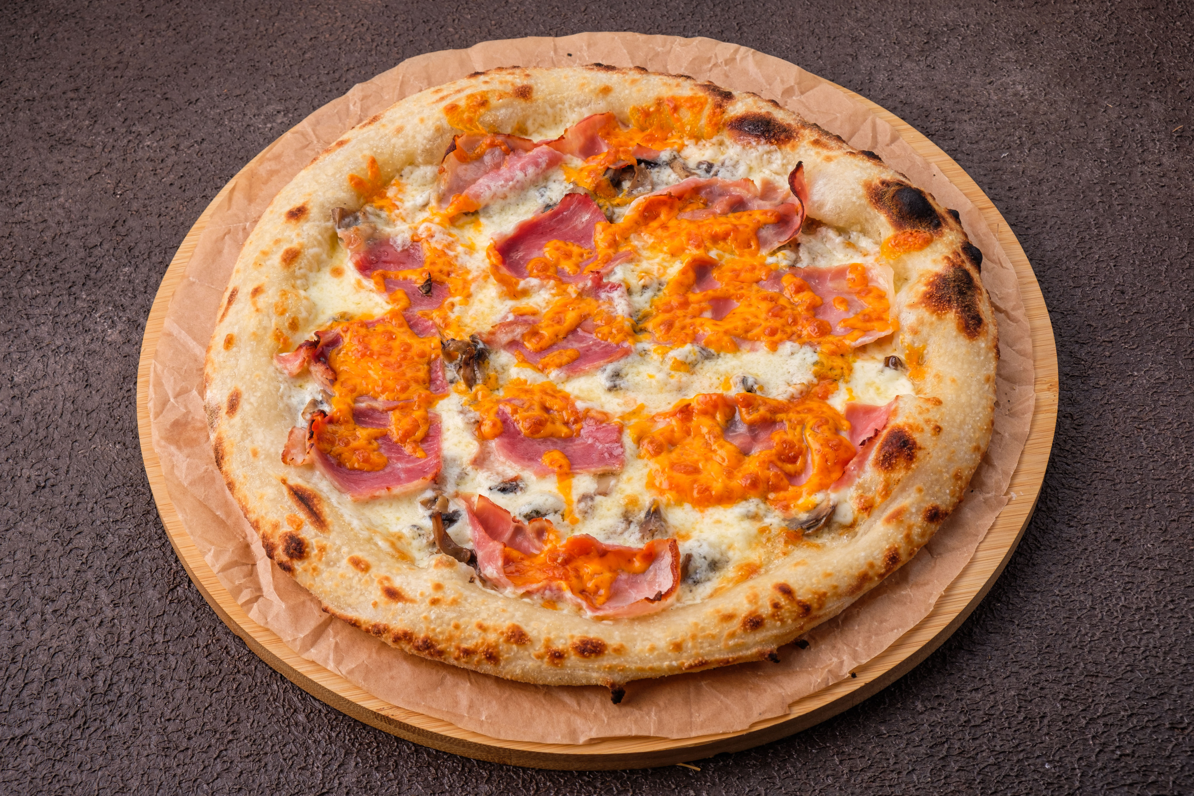 Тесто для пиццы, соус блю чиз, сыр моцарелла, грибы шампиньоны, ветчина, сыр чеддер.