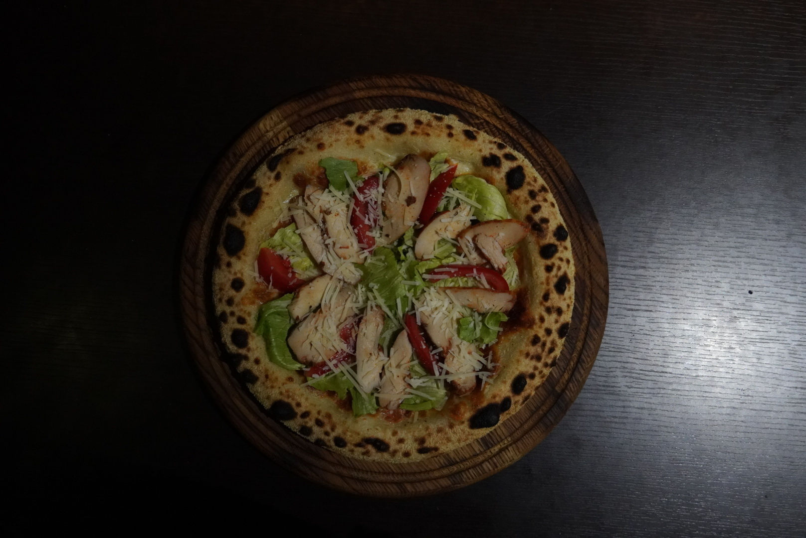 Тесло для пиццы, соус цезарь, сыр моцарелла, томаты свежие, куриное филе, салат айсберг, сыр пармезан.