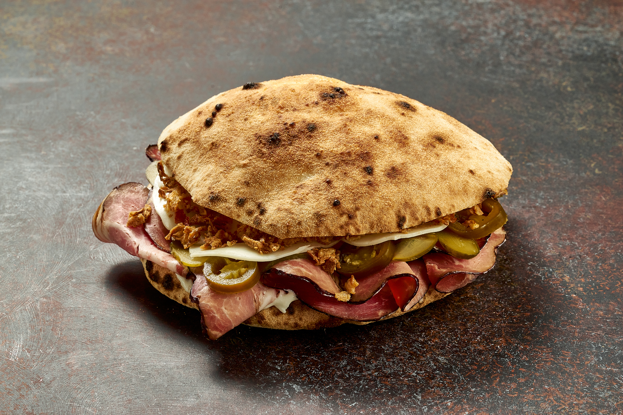 Пучча, соус цезарь, сыр моцарелла, огурец свежий, окорок, томаты свежие, лук фри.