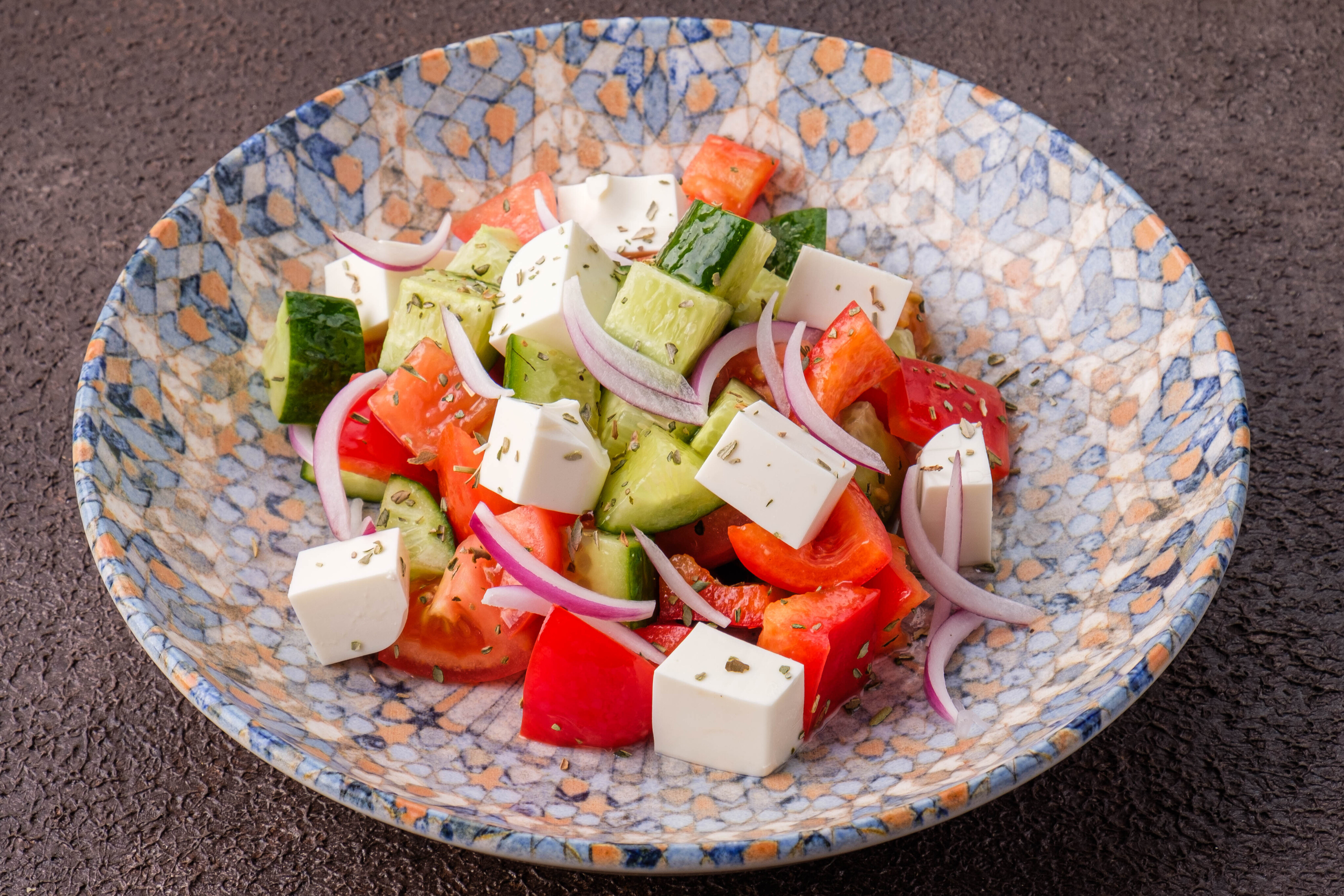 Перец болгарский, томаты, лук красный, огурец свежий, сыр фета, оливки, маслины, масло оливковое